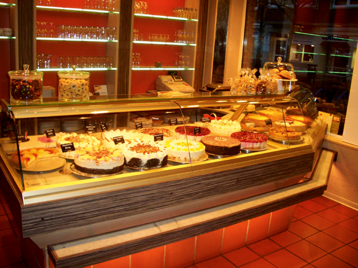 Große Kuchenauswahl aus eigener Produktion, reichhaltige Frühstücksauswahl.